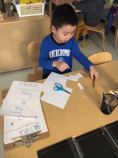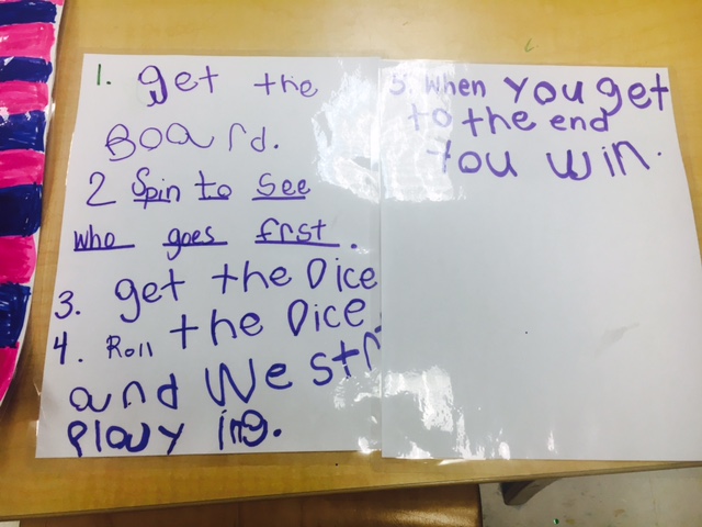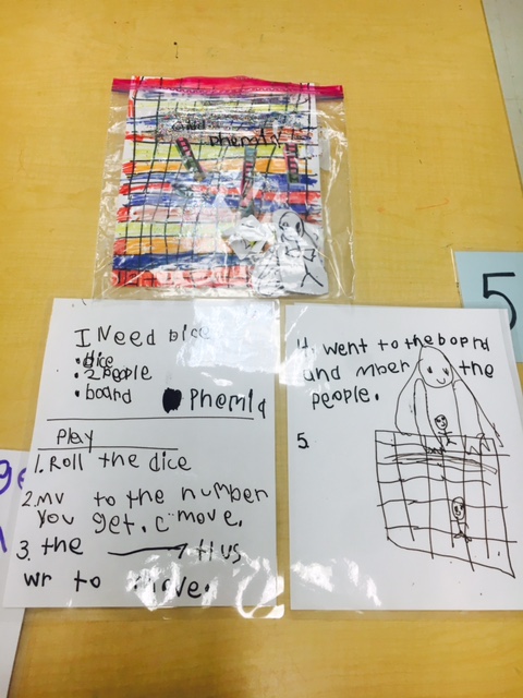 After the week of being immersed in board games, two Choice Time centers were opened. At one center, children could play commercial board games. The second center was one where children could create their own, original games, introduce the games to the class and add them to the game center.
