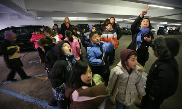 To be out of school on a sunny winter’s day and walking to a municipal parking garage — it doesn’t get any better than that. Kammi Poom skipped the whole way. Alan Zhao thought it was hilarious to walk like Frankenstein. Evan Nuñez, the smallest, hurried so he could be up front with Ms. Krings.