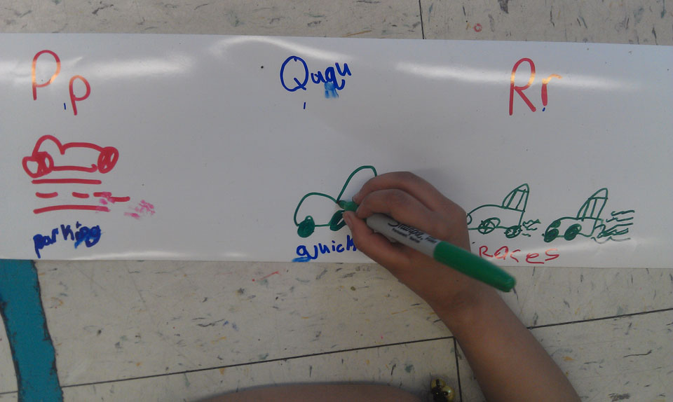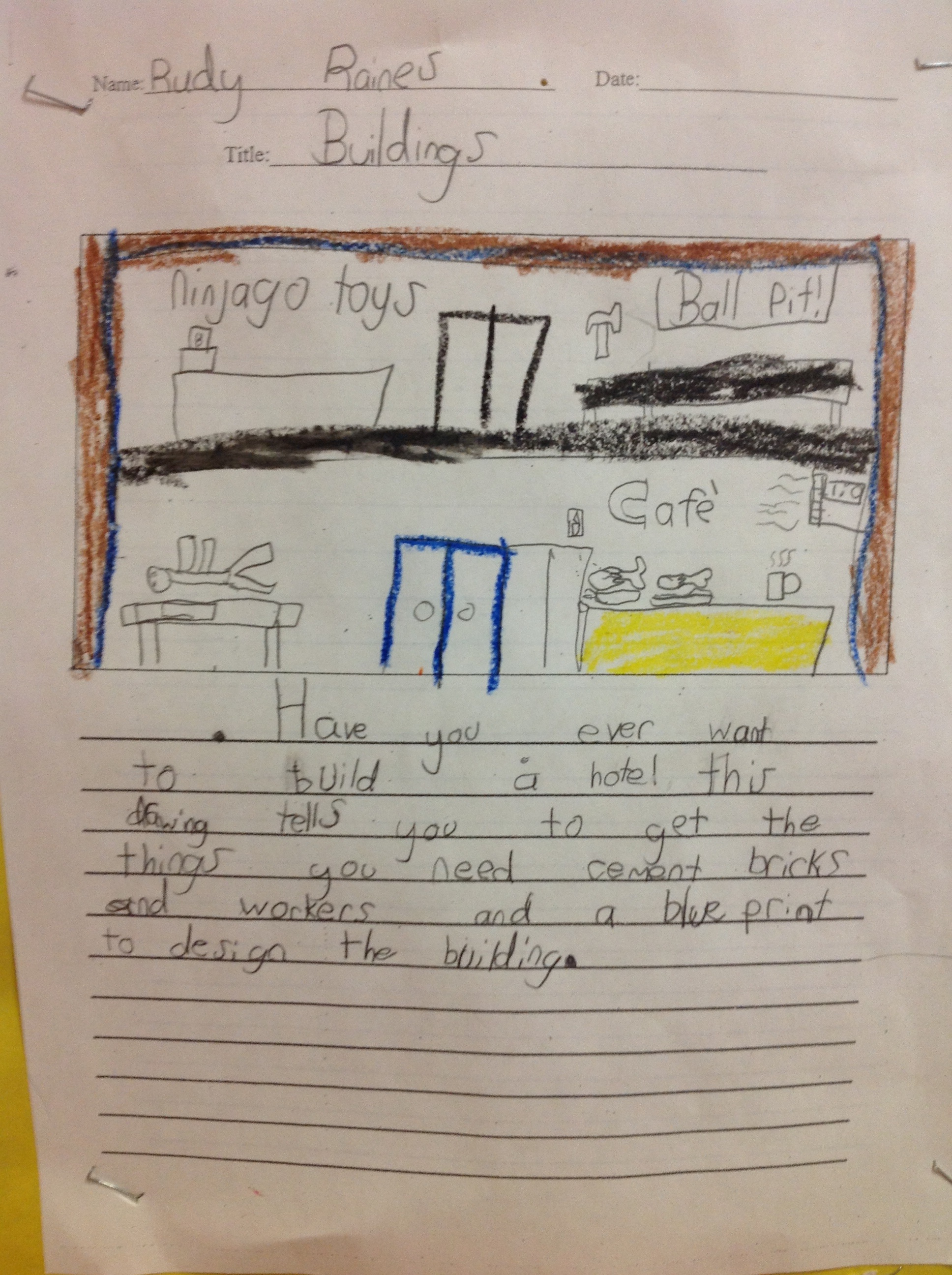 These first graders, mostly English language learners, are writing a script for a puppet show that they will present at their project celebration. It will be a story that describes how we can care for hamsters, the animal that their class had been studying.