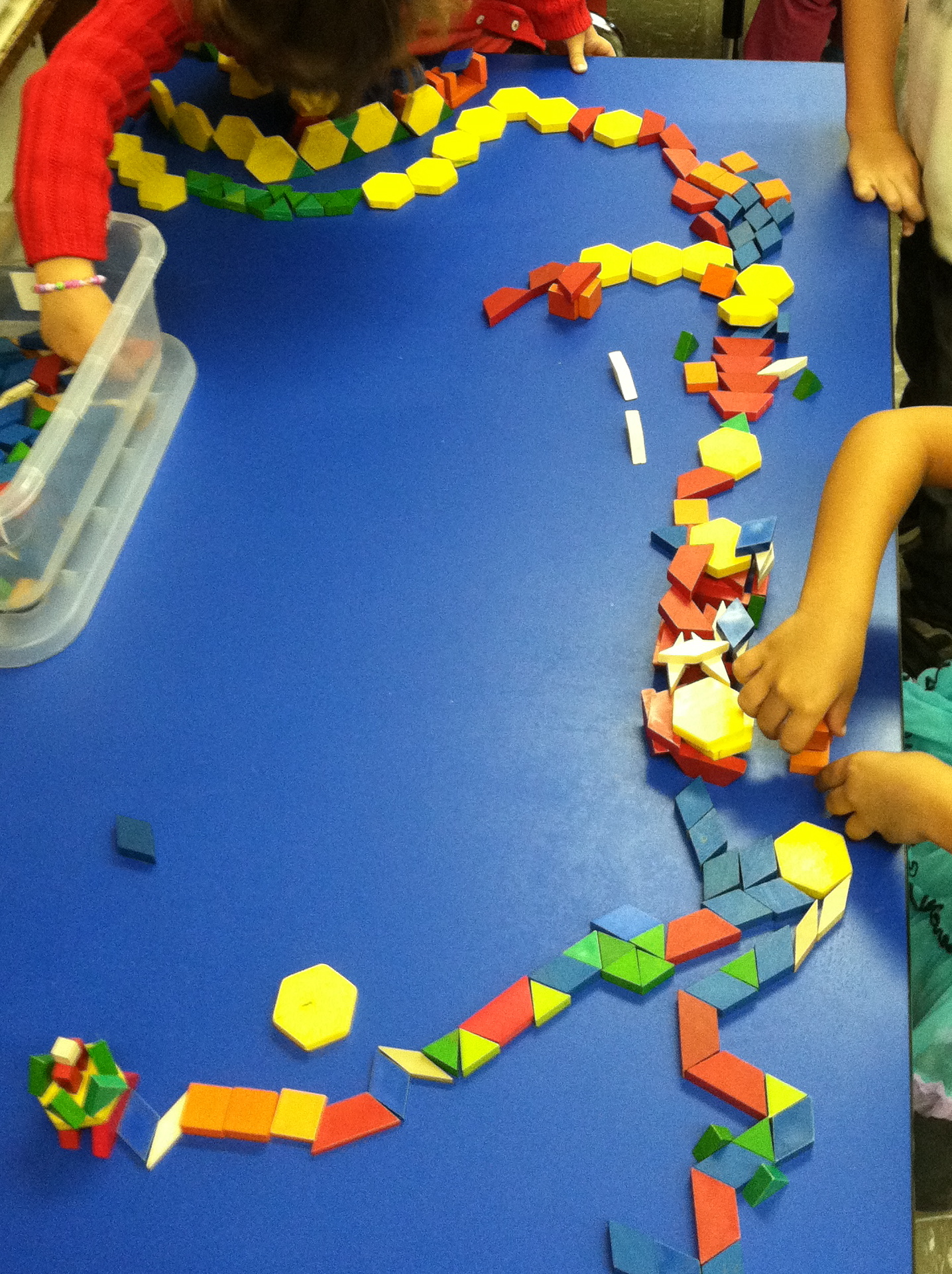 Bill realized that, at this point in the year, it’s not easy to involve 24 four and five year olds in a complex class discussion. He decided to see what would happen if children were given pattern blocks and encouraged to create pattern-block playgrounds. At first the children worked individually.