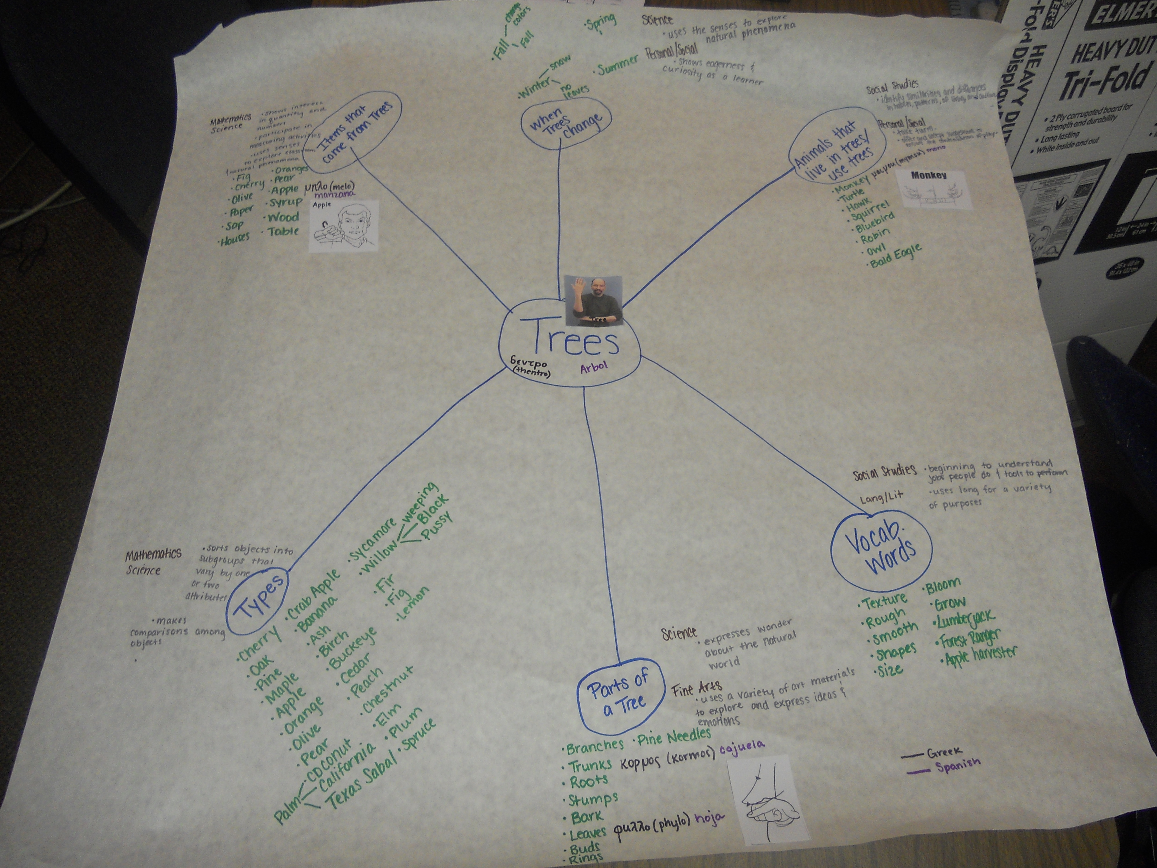 Because the web is preparation for an inquiry study, I personally prefer starting out the web with questions, anticipating what questions children might pose. On the Illinois Projects in Practice site, there is a sample Tree Study web that begins with possible questions. They are: In what ways do trees change?; What are the parts of trees?; What do trees need?; Where can we see trees change?; Who/What needs trees?; What tools do they use?; Who works with trees?; Do people cause changes in trees?; What writing is there about trees?