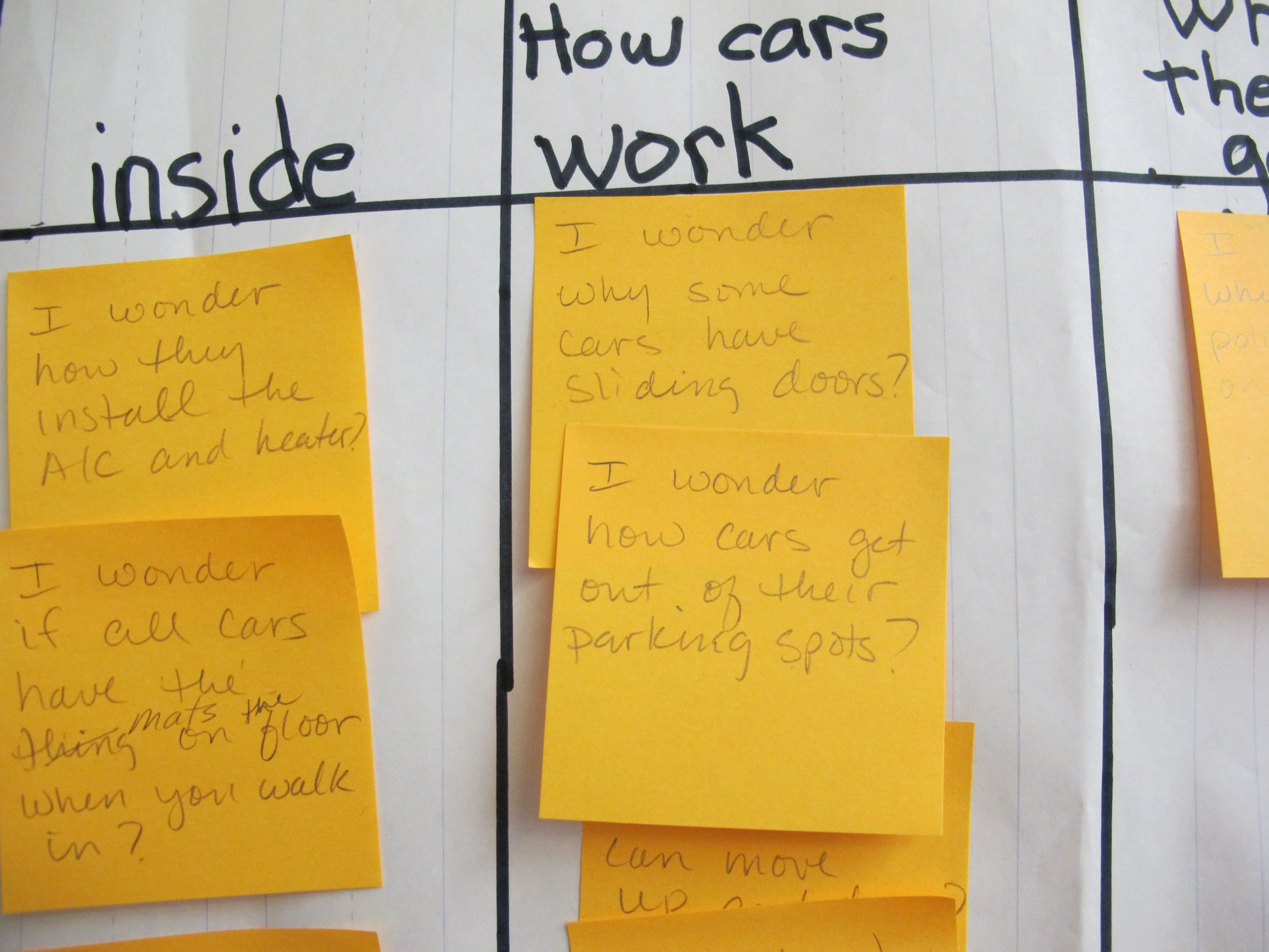 After recording their information on post its, the teacher will usually meet with a small group of children to begin organizing these notes into categories. A few of the post-its are read through together and discussed. Children think about which statements belong together. For example, in the Car Project, children might have said, “Cars have engines” “You can take a car to ride to the country” “Car drivers have to follow traffic rules” “There are seatbelts in cars” “Cars can go fast “I went to Coney Island in a car”. The small group might then organize these statements into these categories. ” HOW CARS CAN GO, WHERE CARS CAN GO, PARTS OF A CAR, RULES FOR CARS. This chart is then shared at meeting time and the entire class then completes this. Using a small group to begin makes the process more manageable for children who would lose focus when presented with too much information.