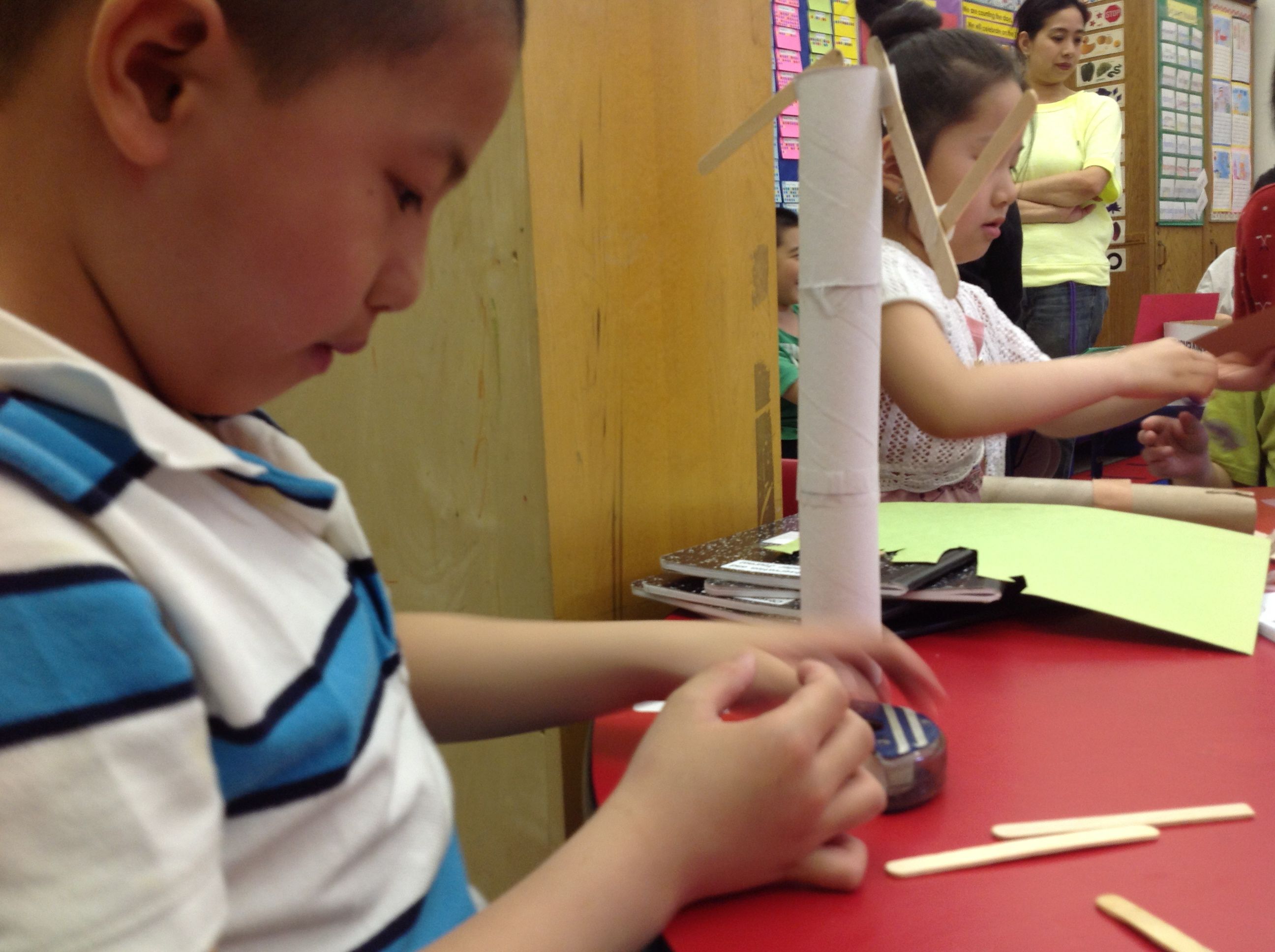 One group thought of their work in terms of the construction that they saw happening in the neighborhood. They wore hard hats and goggles and added plastic tools to the center. Always, though, there was so much collaboration and pride.