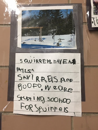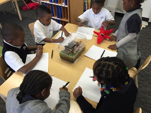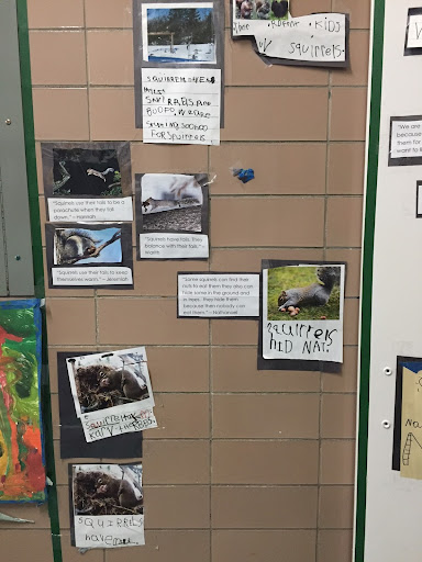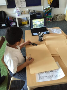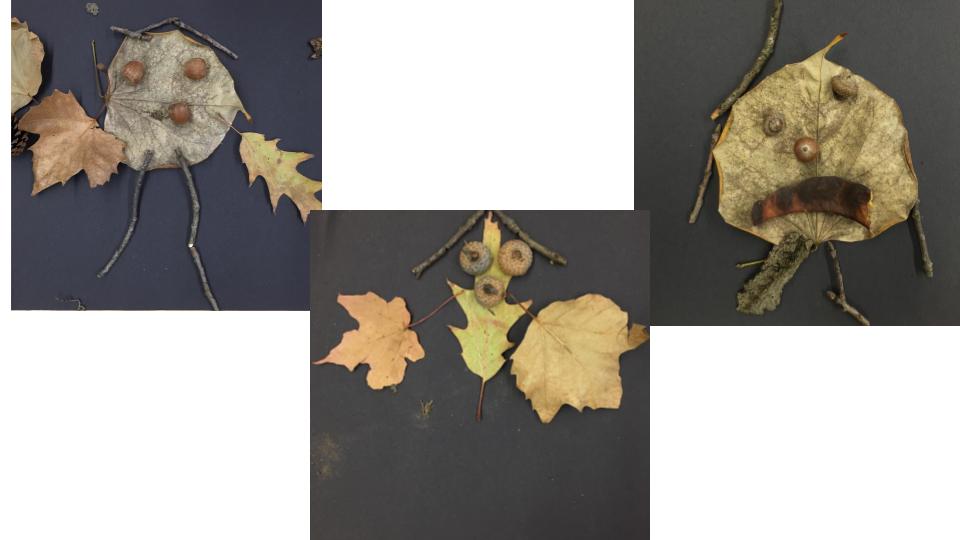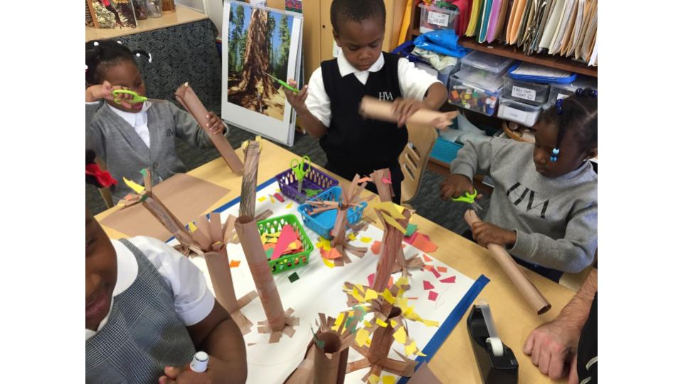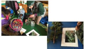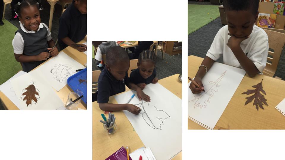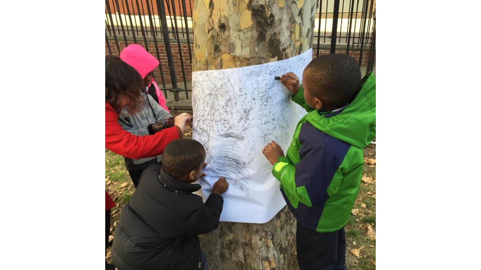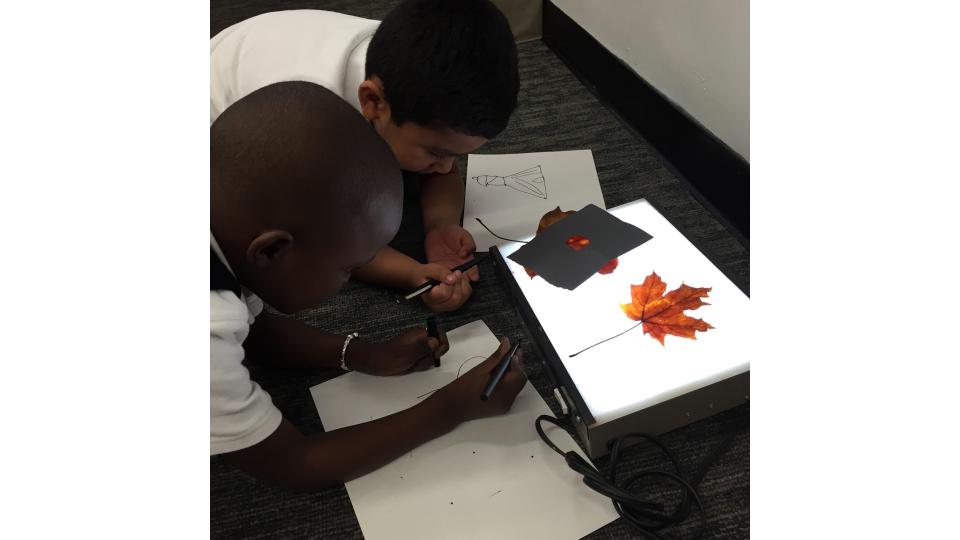 the leaves of other inquiry group leaves. They looked at their leaves on a light box and examined the veins by looking at them through the hole of a “detail finder”, a piece of paper with a small circular window cut into it. They went outside and studied the bark of their tree.