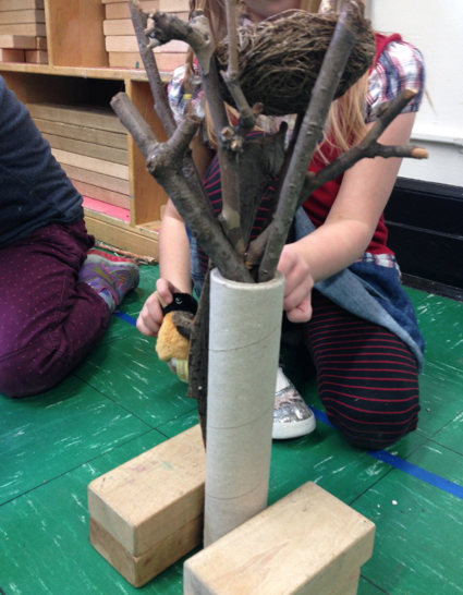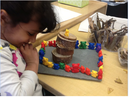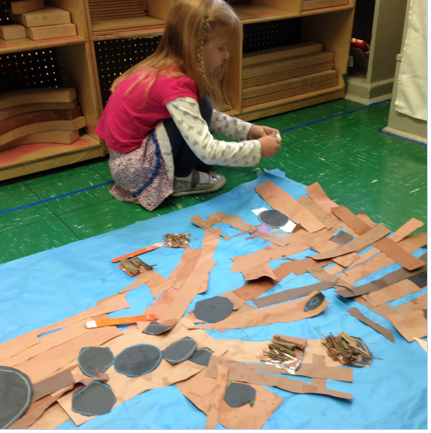 By this time of the year, my instructional focus is more towards giving children opportunities to work on expanding their projects. Children are encouraged to build onto a project. A few examples are adding more details or color to a drawing or painting. They might create signs and add people and animals to a block structure. In my class and in other classes I’ve seen the dramatic play area transformed into a doctor’s office, a post office, a castle, a grocery store and even a playground. The water table becomes an exciting center for making new discoveries just by adding new materials such as food coloring, ice cubes, snow or soap suds. I remember a time when a group of children used the Cuisenaire rods and small wooden ‘people’ from the block center to create a village in the sand table. What is so exciting is that the possibilities are endless depending upon the children’s interests.